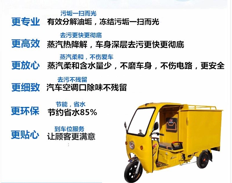 采用蒸汽高壓技術(shù)洗車,引進歐美先進技術(shù),擁有清水、泡沫、吸塵、風干、鍍膜、除臭、凈手、玻璃水添加、防凍等齊全的功能,省水省電、節(jié)能環(huán)保、機型美觀、性能穩(wěn)定,節(jié)省費用,方便實用